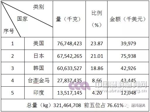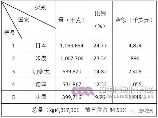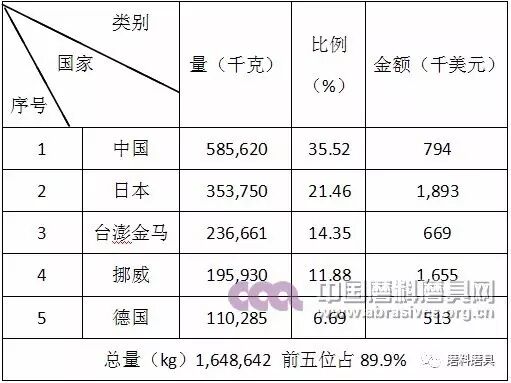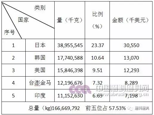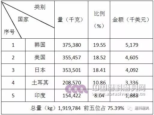 从表中看出,出口到亚洲地区的各类产品所占比例分别为天然刚玉25.23%,棕刚玉50.08%,人造刚玉40.94%,碳化硅59.98%,碳化硼62.19%,磨具70.96%,所占比例除了天然刚玉低于美洲外,其余都是比例最高的,出口前五名国家亚洲国家(表五)占比最大,我们出口的目的地主要还是集中在亚洲,美国也是我们的主要出口地,美洲所占比例主要还是出口到美国的。从出口到非洲的产品比例看都在上升是一个增长点(棕刚玉增长31.98%,碳化硅增长9.09%,磨具21.02%)。