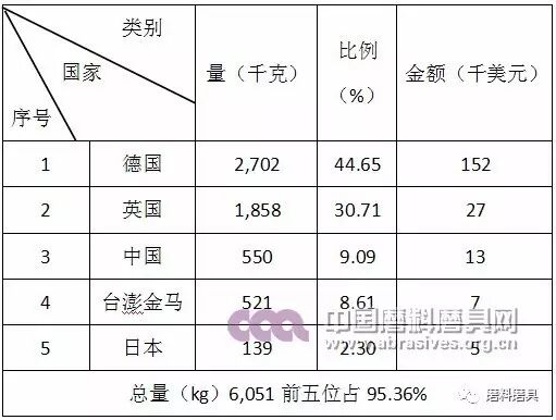 从表中看,棕刚玉676.8吨,金额1756千美元,同比分别量下降2.98%,金额上升1.40%,均价上升4.84%;天然刚玉1.28万吨,3996千美元,同比分别上升43.18%和7.20%,均价降低26.19%;其他人造刚玉4317.96吨,19996千美元,同比分别下降57.17%和11.28%,均价同比上升106.7%;碳化硅1648.64吨,金额7047千美元,同比分别下降46.81%和30.86%,均价同比上升29.79%;碳化硼6.05吨,金额226千美元,同比量增加3.52%,金额下降77.89%,均价同比下降56.99%;磨具9615.65吨,金额170024千美元,同比分别下降7.18%和3.45%,均价同比上升4%。