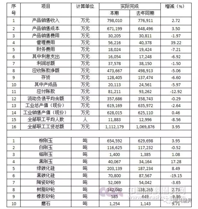 根据对行业主要产品主要产地的统计,棕刚玉全年产量130万吨左右,实际的销量为155万吨左右,同比上升3.3%,白刚玉22万吨左右,实际销量24万吨左右,同比上升9.09%,黑碳化硅产量55万吨左右,实际销量65万吨左右,同比上升1.56%,绿碳化硅产量23万吨左右,同比下降4.17%,树脂磨具产销量48万吨左右,同比上升4.4%,陶瓷磨具产销量24万吨左右,同比下降4%。